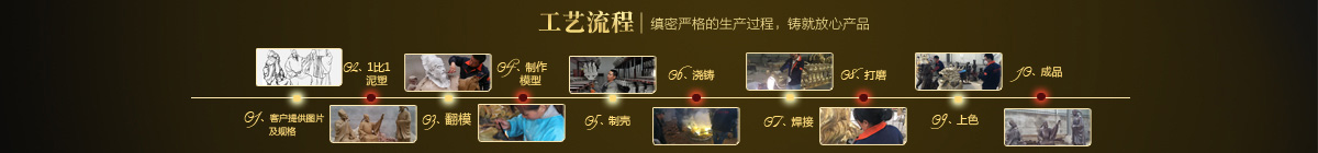制作一件完美的人物雕塑,最重要的步驟就是制作泥塑模型,然后再用工業(yè)硅膠拓印、翻模。所以人物雕塑的姿態(tài)、神情生動、莊嚴(yán)與否直接影響最終人物雕塑的品質(zhì)。所以我廠一直對人物泥塑模型的制作格外重視。我廠以雕塑為本,以藝術(shù)為根,挾中華文化之傳統(tǒng),盡顯淋漓盡致。我們本著大膽創(chuàng)新、勇于突破的精神,以追求卓越為導(dǎo)向,堅持寧缺勿濫為原則,并可依照您提供的要求,為您量身設(shè)計制作。我廠人才濟濟,有智慧嚴(yán)謹(jǐn)?shù)墓芾戆嘧樱袑I(yè)技術(shù)精湛的人物雕塑制作人才和專業(yè)的施工隊伍。他們不僅具深厚的文化藝術(shù)底蘊,更汲取當(dāng)代雕塑精華,博采眾家之長,作品既有嚴(yán)肅莊重寫實題材,也有輕松前衛(wèi)的抽象題材,表現(xiàn)手法上浪漫主義中不乏樸實,現(xiàn)實主義中蘊涵著激情,設(shè)計理念深刻詮釋著藝術(shù)的精髓,把古典主義和后現(xiàn)代主義完美的融合,將佛像雕塑藝術(shù)演繹為力的凝聚、美的體現(xiàn),讓人們感受到的不僅是一種藝術(shù)的浪漫與優(yōu)雅、粗獷與悲壯、更是豐富的優(yōu)秀藝術(shù)寶藏和文化傳統(tǒng),讓您在藝術(shù)與文化中穿流,在時空中飄蕩,使靈魂在藝術(shù)的海洋洗禮。 MORE+